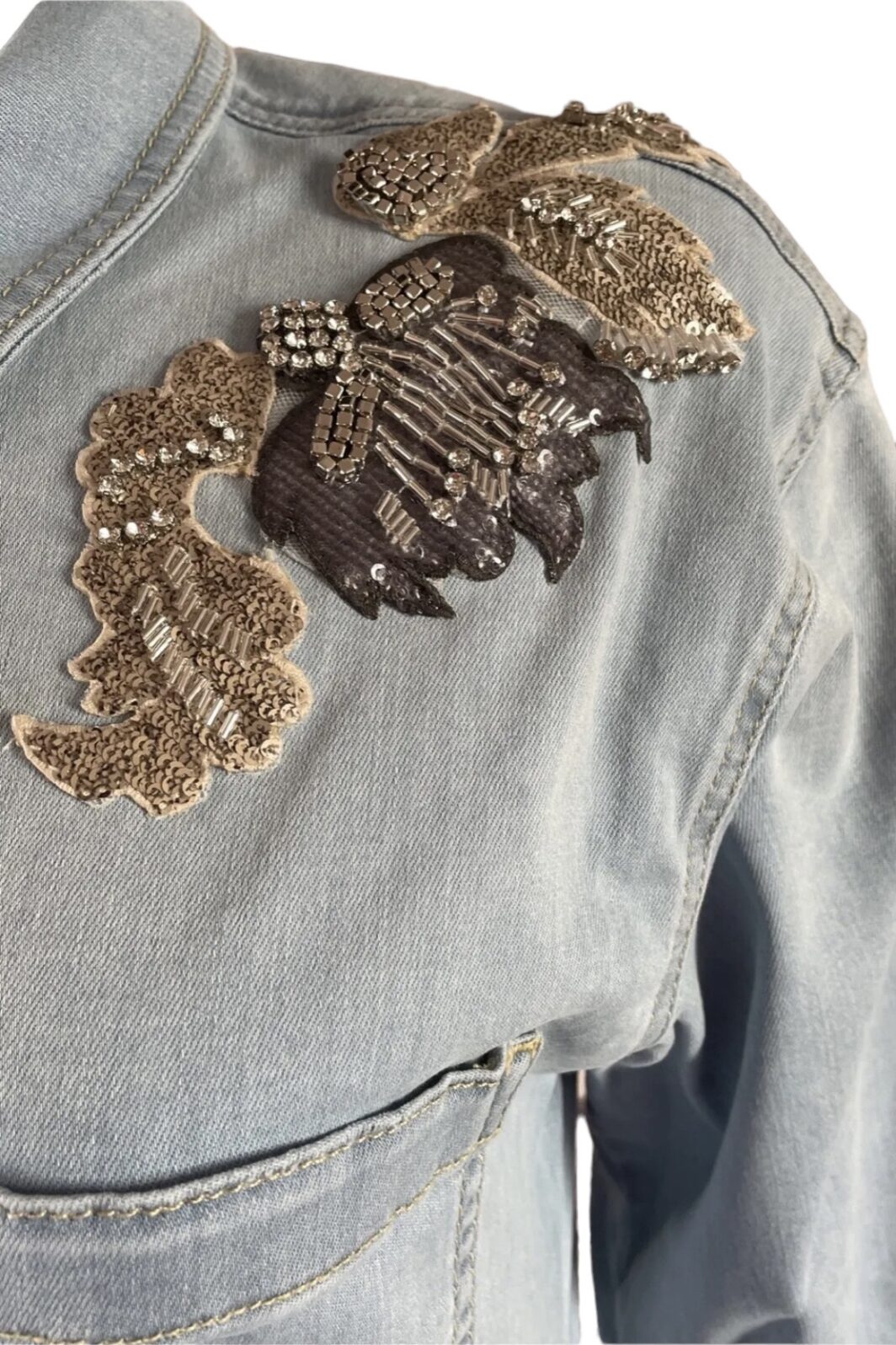 Extra: seitliche Eingriffstaschen , Stick-Applikationen aus Pailletten , Stiftperlen und Chatons